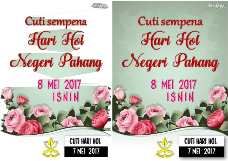 20 Mei 2019 Cuti Sempena. 07 Mei 2019 Cuti Sempena. 07052019 Pentadbiran Pengertian Hari Hol Rakyat Pahang Perlu Tahu Mungkin ramai diantara kita masih tidak mengetahui pengertian sebenar Hari Hol dan tertanya-tanya mengapa Negeri Pahang cuti pada 7 Mei setiap tahun.
