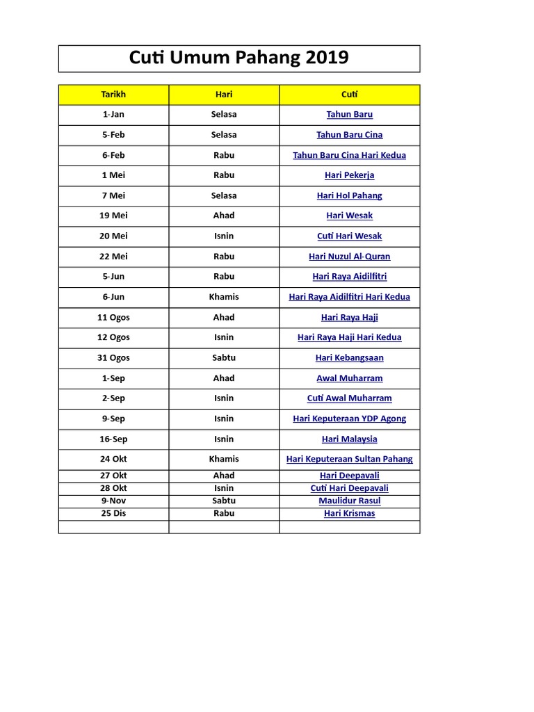 Walau bagaimanapun dalam Kalendar pahang Cuti Umum pahang tarikh yang dinyatakan mungkin tertakluk kepada perubahan rasmi yang biasanya diumumkan dalam. DAFTAR HARI KELEPASAN AM NEGERI PAHANG 2019 KELEPASAN AM HARI TARIKH Tahun Baru 2019 Selasa 01 Januari 2019 Tahun Baru Cina Selasa 05 Februari 2019 Rabu 06 Februari 2019 Hari Pekerja Rabu Hari Hol Selasa 01 Mei 2019 Hari Wesak Hari Buddha Ahad 07 Mei 2019 Hari Nuzul Al-Quran Rabu 19 Mei 2019 Hari Raya Aidilfitri Rabu 22 Mei 2019. 22 Mei 2019 Cuti Sempena.